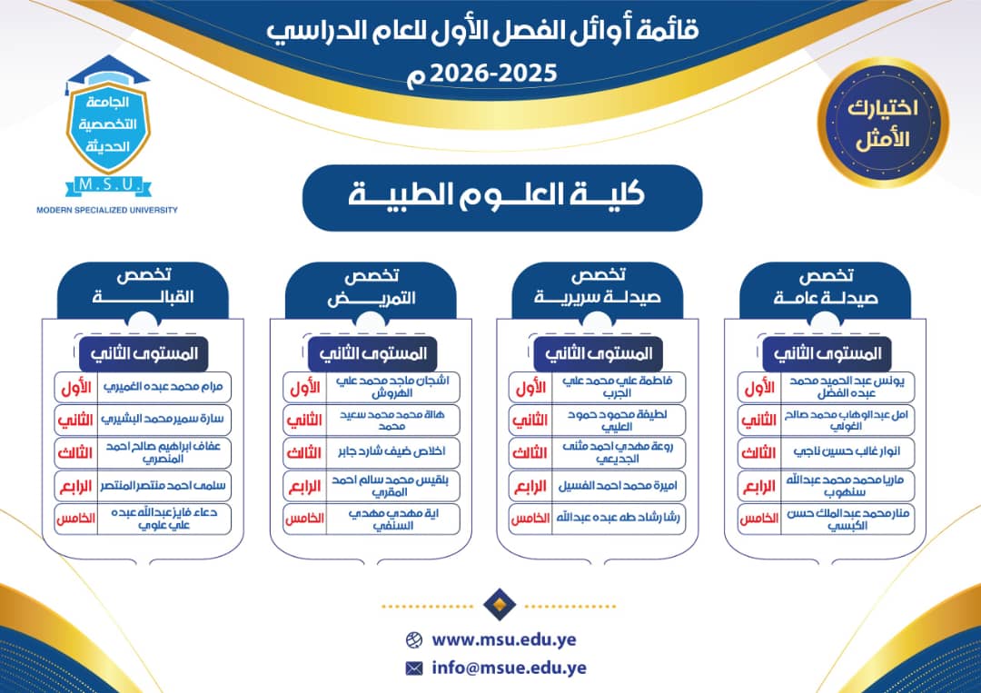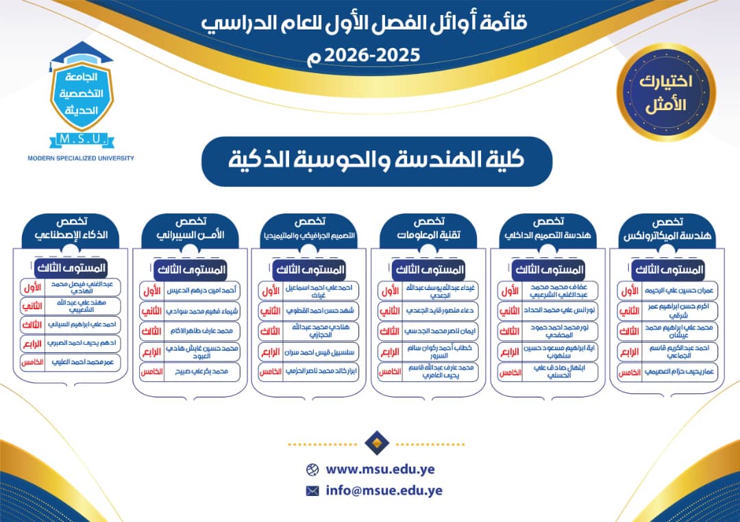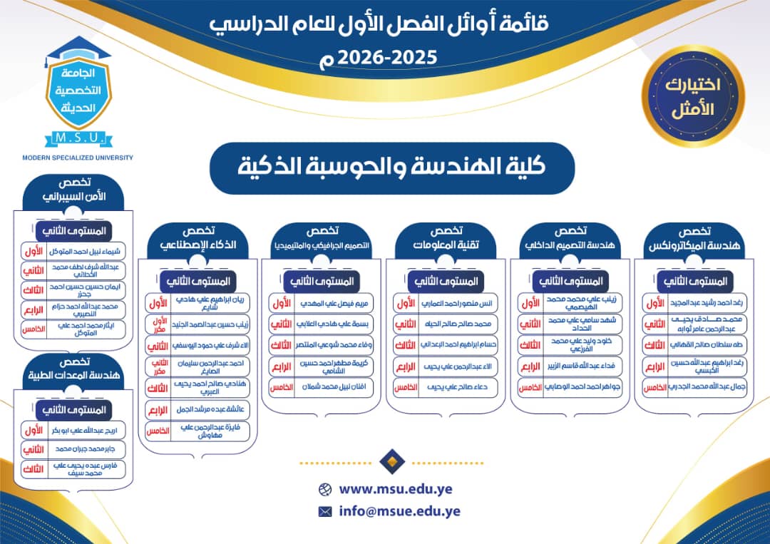 اوائل الفصل الاول 2025-2026 Date 14 نوفمبر، 2025 اوائل الطلبة في الجامعة – الفصل الاول 2025-2026 نهنئ ونبارك ابنائنا وبناتنا الاوائل للفصل الاول من العام الدراسي 2025-2026م . Share: Dr.Mujahed Aljober Previous post زيارة علمية لطلبة الذكاء الاصطناعي إلى شركة إبداع سوفت 14 نوفمبر، 2025 Next post جداول الامتحانات النهائية للمستوى الاول 16 نوفمبر، 2025 You may also like إنجاز بحثي للجامعة التخصصية “تطبيقات الذكاء الاصطناعي لتأمين شبكات انترنت الاشياء “ 14 أبريل، 2026 الجامعة التخصصية الحديثة تستقبل لجان المتابعة من مجلس الاعتماد الأكاديمي 14 أبريل، 2026 اوائل الفصل الثاني 2025-2026 12 أبريل، 2026
