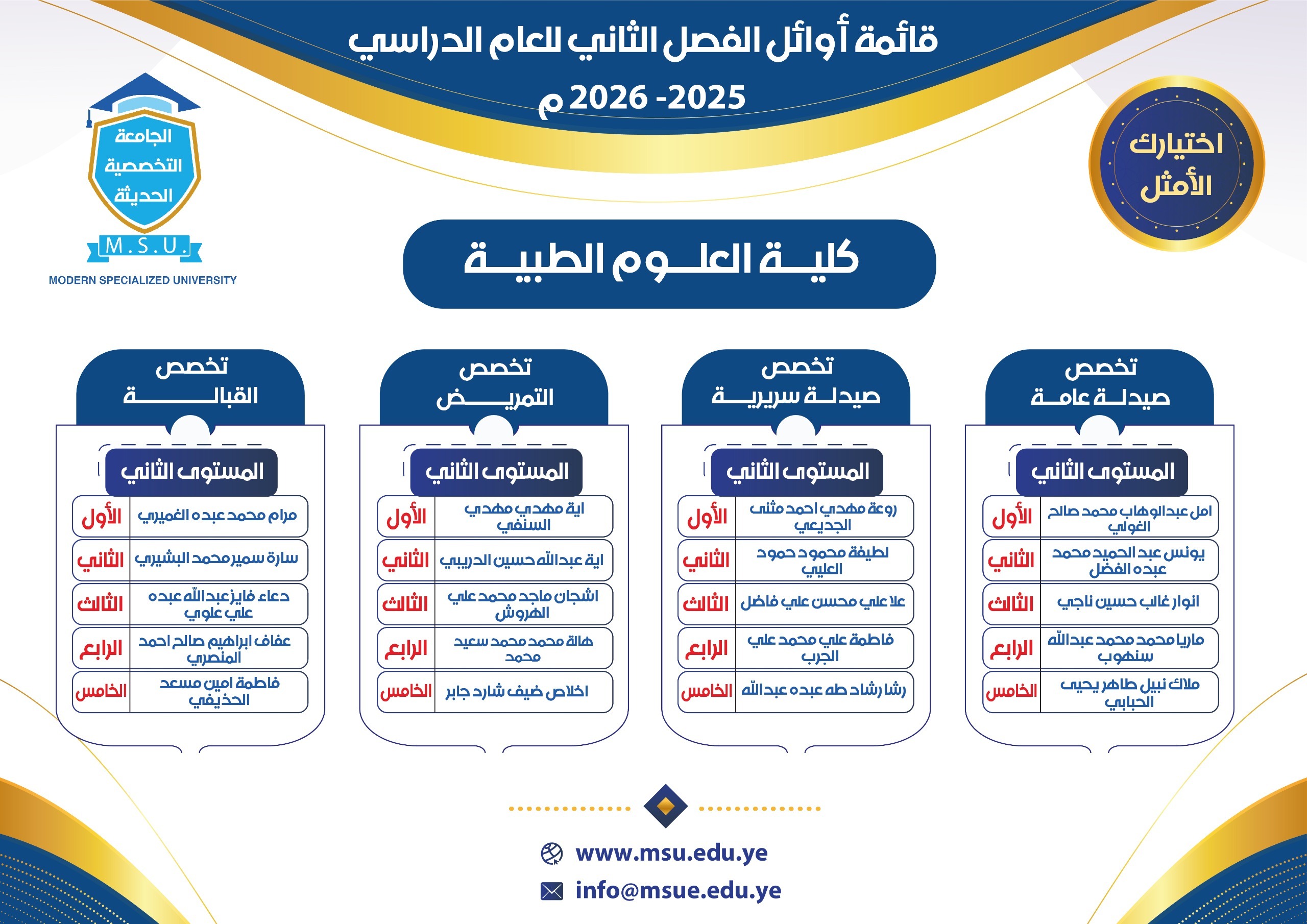 تعلن ادارة الكنترول بالجامعة التخصصية الحديثة عن صدور قائمة اوائل الفصل الثاني 2025-2026