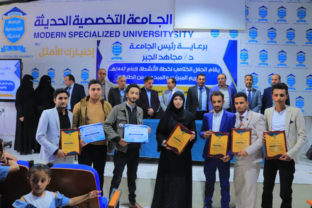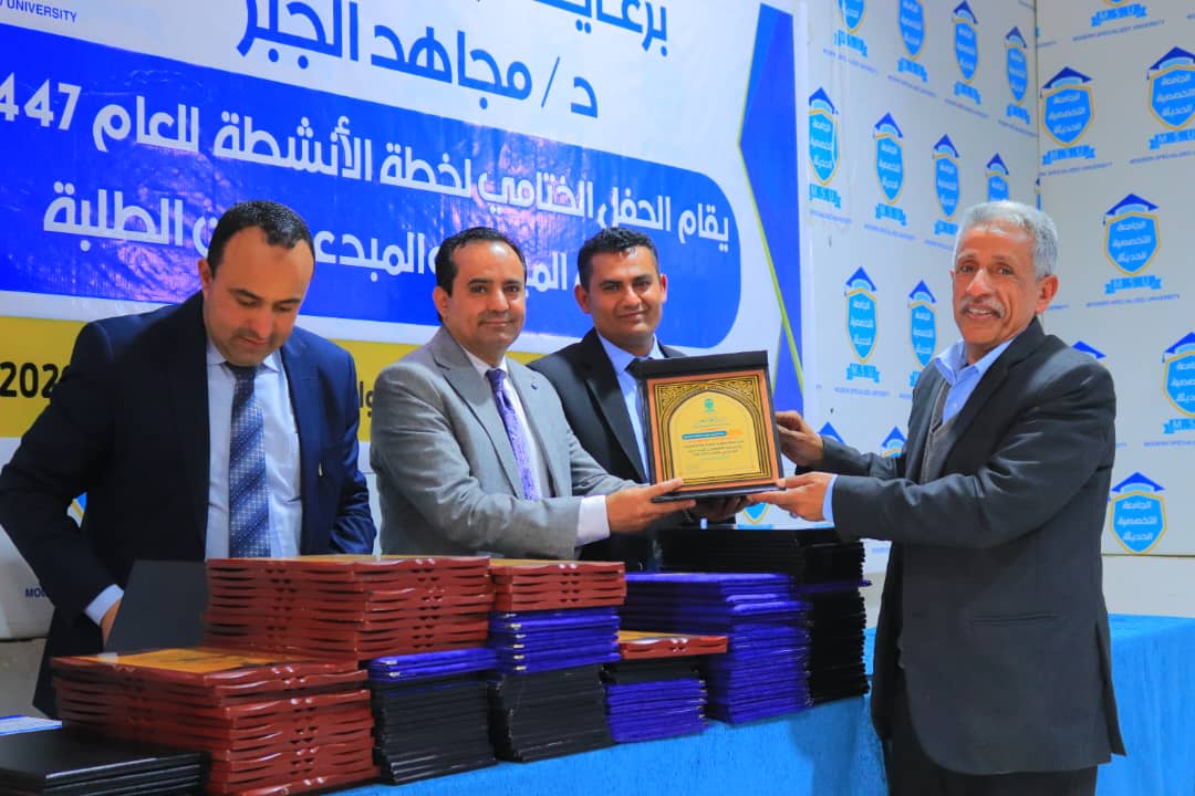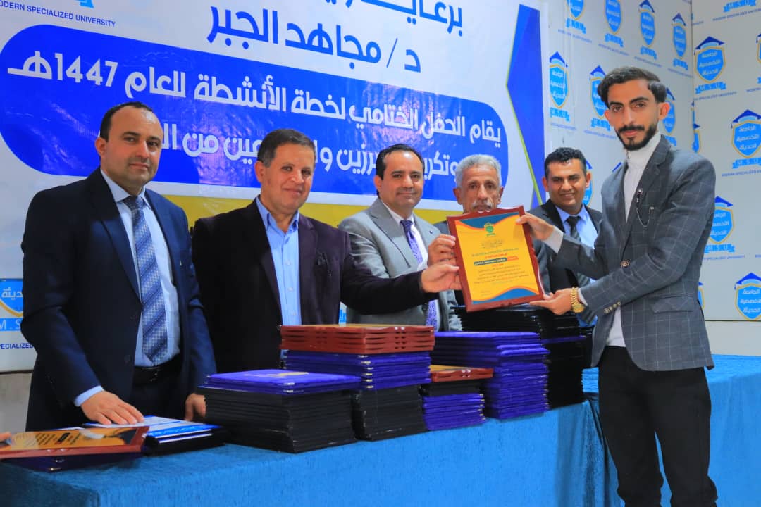 في إطار حرصها على ترسيخ ثقافة التميّز والوفاء، كرّمت قيادة الجامعة التخصصية الحديثة نخبةً من رؤساء الأقسام الأكاديمية إلى جانب الطلبة المبدعين في مجالات الأنشطة العلمية والثقافية والرياضية، تقديرًا لجهودهم البارزة وإسهاماتهم الفاعلة في إنجاح البرامج والفعاليات الطلابية خلال العام الدراسي.